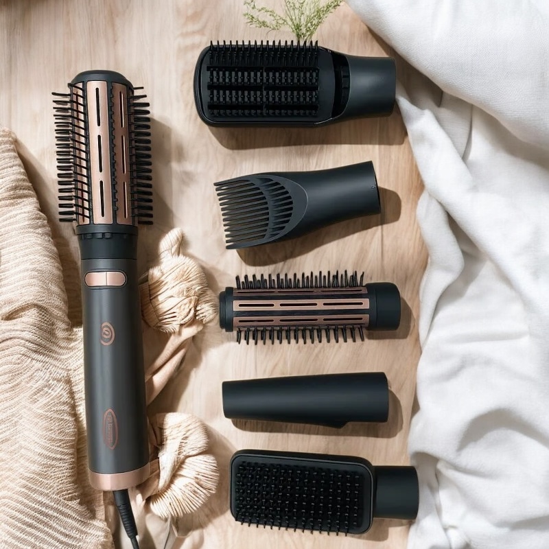 - Composition : Brosse ronde 50 mm, Brosse ronde 38 mm, Concentrateur d'aire, Brosse peigne à doigt, Brosse plate lissante, Brosse de massage, Brosse chauffante auto-rotative, Sac de rangement offert.